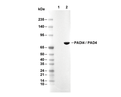 • Lane 1: HEK293T (transfected with pCMV6-ENTRY control), Lane 2: HEK293T (transfected with pCMV6-ENTRY PADI4 / PAD4)