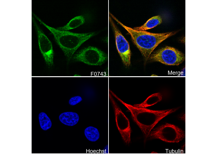 • Immunofluorescent analysis of Hela cells using F0743 (green, 1:1600), Hoechst (blue) and tubulin (Red).
