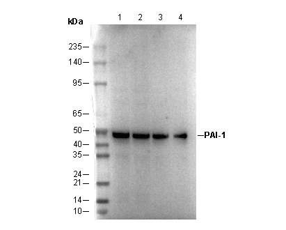 PAI-1 Antibody [J4H7] recognizes endogenous levels of total PAI-1 protein. Faint upper bands seen in some cell extracts in the 70 kDa to 100 kDa range are of unknown identity, and believed to be non-specific.