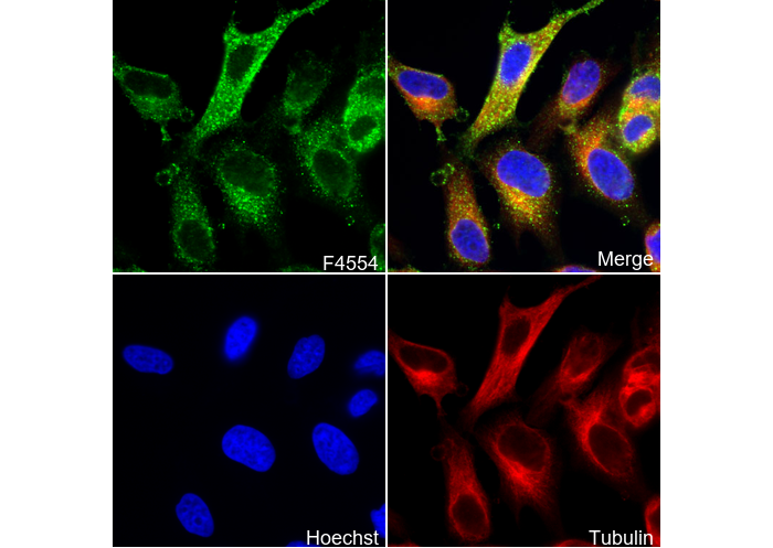 • Immunofluorescent analysis of Hela cells using F4554 (green, 1:20), Hoechst (blue) and tubulin (Red).