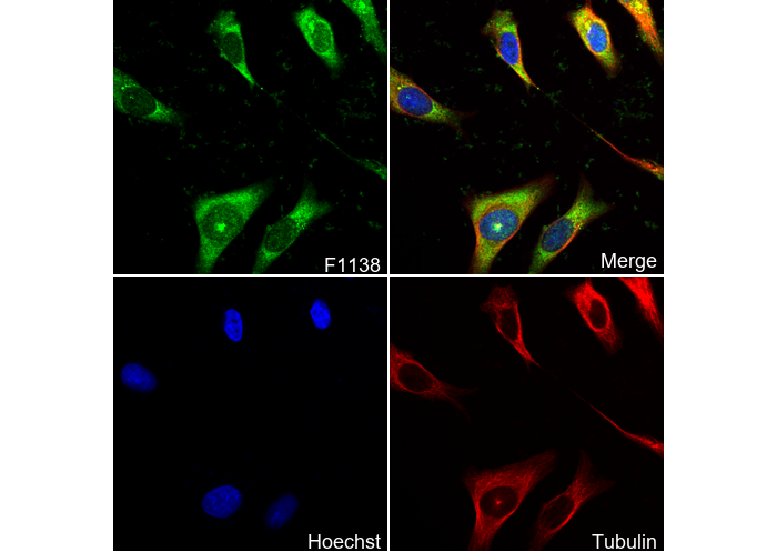 • Immunofluorescent analysis of Hela cells using F1138 (green, 1:100), Hoechst (blue) and tubulin (Red).