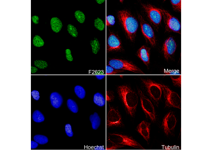 • Immunofluorescent analysis of Hela cells using F2623 (green, 1:100), Hoechst (blue) and tubulin (Red).