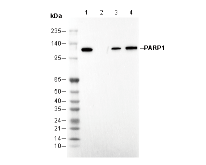 • Lane 1: HAP1 , Lane 2: HAP1 (KO PARP1) , Lane 3: HeLa , Lane 4: HEK-293T