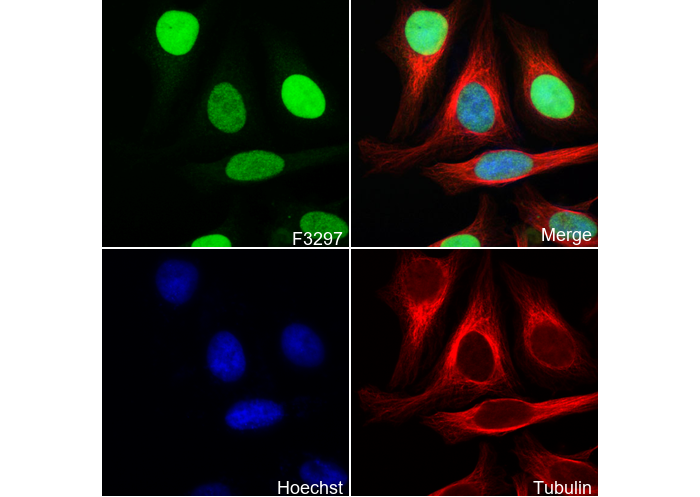 • Immunofluorescent analysis of Hela cells using F3297 (green, 1:50), Hoechst (blue) and tubulin (Red).