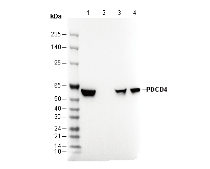 • Lane 1: HeLa, Lane 2: HeLa (KO PDCD4), Lane 3: HEK-293, Lane 4: Jurkat