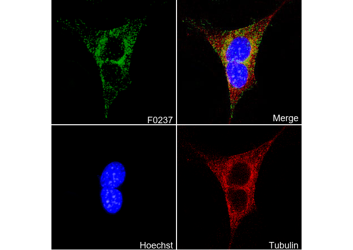 • Immunofluorescent analysis of NIH/3T3 cells using F0237 (green, 1:100), Hoechst (blue) and tubulin (Red).