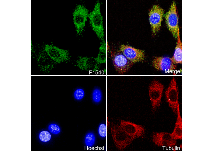 • Immunofluorescent analysis of NIH/3T3 cells using F1540 (green, 1:100), Hoechst (blue) and tubulin (Red).