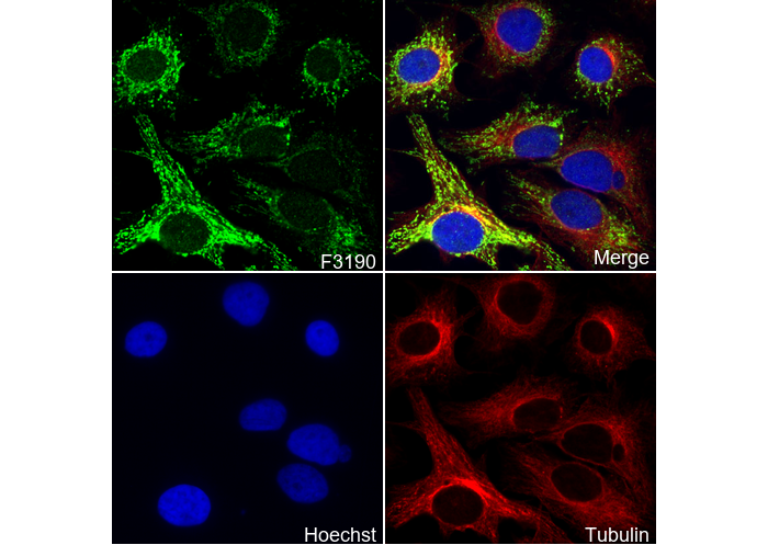 • Immunofluorescent analysis of HepG2 cells using F3190 (green, 1:50), Hoechst (blue) and tubulin (Red).