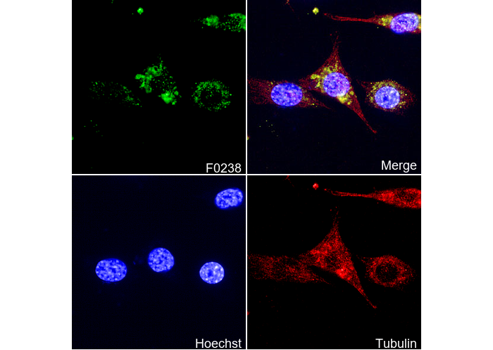 • Immunofluorescent analysis of NIH/3T3 cells using F0238 (green, 1:100), Hoechst (blue) and tubulin (Red).