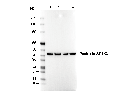 Pentraxin 3/PTX3 Antibody [M10M8] recognizes endogenous levels of total Pentraxin 3/PTX3 protein.