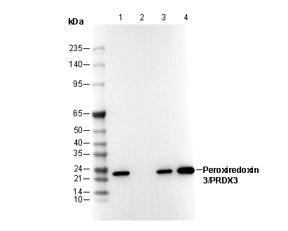 • Lane 1: HeLa , Lane 2: HeLa (KO PRDX3), Lane 3: MCF7, Lane 4: A431