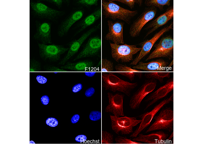 • Immunofluorescent analysis of Hela cells using F1204 (green, 1:100), Hoechst (blue) and tubulin (Red).