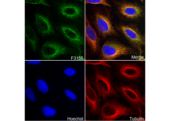 • Immunofluorescent analysis of Hela cells using F3155 (green, 1:50), Hoechst (blue) and tubulin (Red).