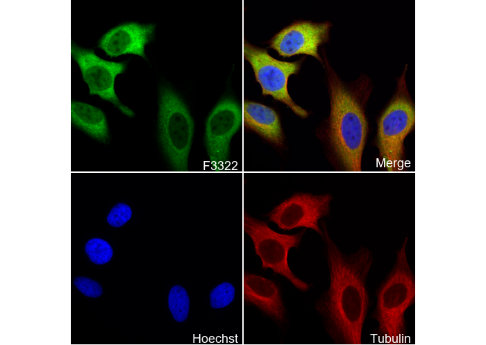 • Immunofluorescent analysis of Hela cells using F3322 (green, 1:500), Hoechst (blue) and tubulin (Red).