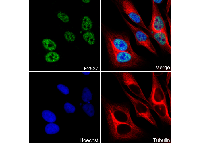 • Immunofluorescent analysis of Hela cells using F2637 (green, 1:400), Hoechst (blue) and tubulin (Red).