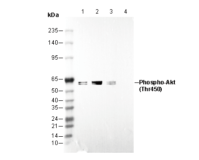 Phospho-Akt (Thr450) Antibody [J1B12] recognizes endogenous levels of Phospho-Akt only when phosphorylated at Thr450.