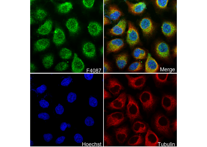 • Immunofluorescent analysis of MEF cells using F4087 (green, 1:200), Hoechst (blue) and tubulin (Red).