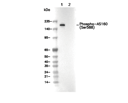 Phospho-AS160 (Ser588) Antibody [A11K10] recognizes endogenous levels of AS160 protein only when phosphorylated at Ser588.