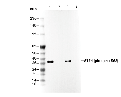 Phospho-ATF1 (Ser63) Antibody [P2B10] detects endogenous levels of ATF1 only when phosphorylated at Ser 63.