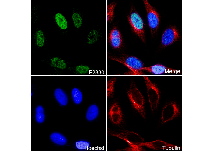 • Immunofluorescent analysis of Hela cells using F2830 (green, 1:500), Hoechst (blue) and tubulin (Red).