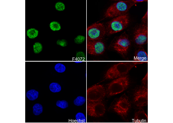 • Immunofluorescent analysis of ACHN cells using F4072 (green, 1:800), Hoechst (blue) and tubulin (Red).
