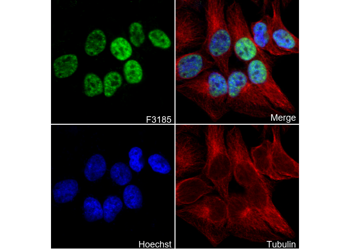 • Immunofluorescent analysis of Hela cells using F3185 (green, 1:100), Hoechst (blue) and tubulin (Red).