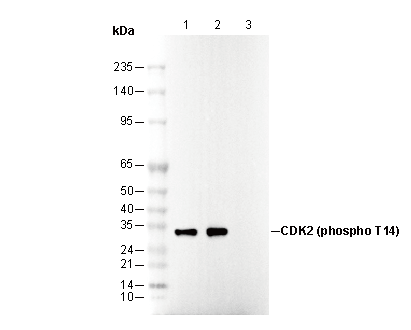Phospho-CDK2 (Thr14) Antibody [F10F1] recognizes endogenous levels of CDK2 protein only when phosphorylated at Thr 14.