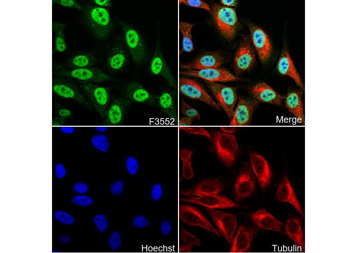 • Immunofluorescent analysis of Hela cells using F3552 (green, 1:50), Hoechst (blue) and tubulin (Red).