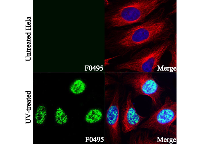 • Immunofluorescent analysis of HeLa cells, untreated (upper) and UV-treated(lower), using F0495 (green, 1:800), Hoechst (blue) and tubulin (Red).