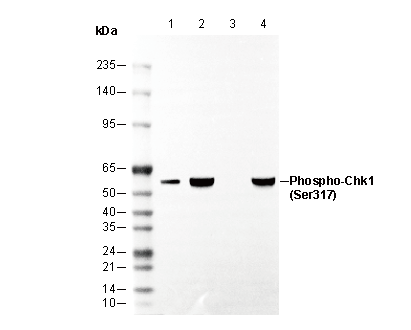 Phospho-Chk1 (Ser317) Antibody [N9E3] recognizes endogenous levels of Chk1 protein only when phosphorylated at Ser317.