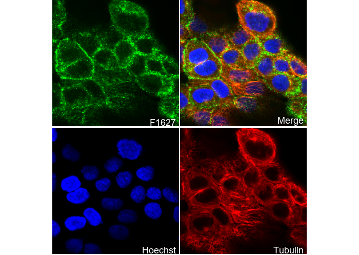• Immunofluorescent analysis of A431 cells (EGF-treated) using F1627 (green, 1:100), Hoechst (blue) and tubulin (Red).