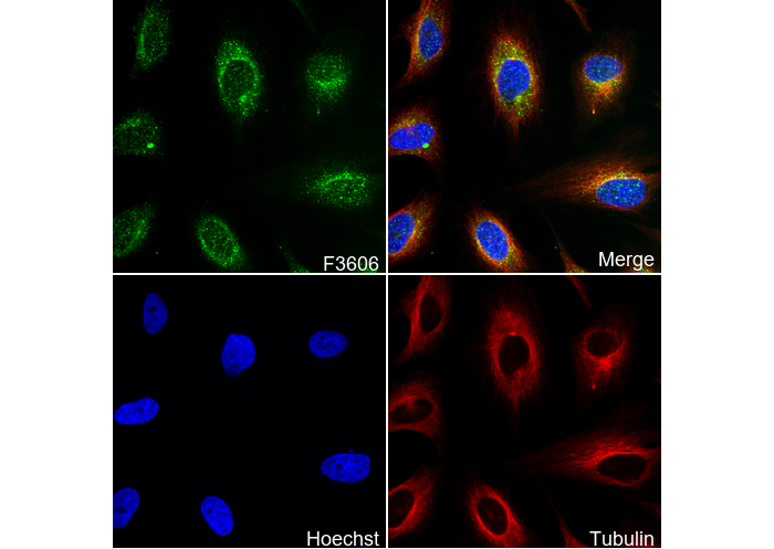 • Immunofluorescent analysis of Hela cells using F3606 (green, 1:50), Hoechst (blue) and tubulin (Red).