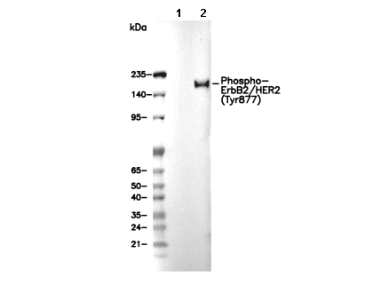 The ErbB2 proto-oncogene, also known as HER2, encodes a 185 kDa transmembrane glycoprotein that functions as a receptor with intrinsic tyrosine kinase activity. Although ErbB2 does not have a known ligand, its kinase activity can be triggered independently of ligand binding, particularly when overexpressed or through dimerization with other members of the ErbB receptor family. ErbB2 gene amplification and protein overexpression occur in approximately 40% of human breast cancers, making it a critical therapeutic target for breast and other epithelial cancers. One potential approach to therapy involves enhancing the degradation of ErbB2 via a c-Cbl-regulated proteolytic pathway. Phosphorylation at tyrosine residue 877, located within the kinase domain and analogous to Tyr416 in pp60c-Src, may influence ErbB2's functional activity. Key autophosphorylation sites on ErbB2 include Tyr1248 and Tyr1221/1222, which facilitate signaling through the Ras-Raf-MAPK pathway.