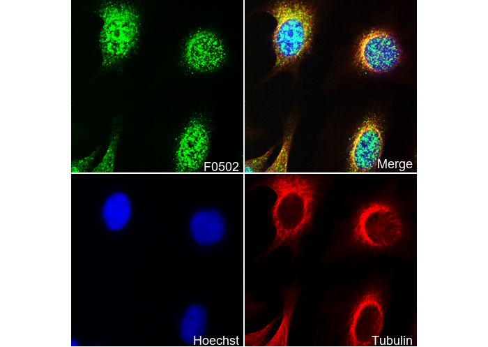 • Immunofluorescent analysis of Hela cells,treated with PDBu (100 nM, 15 min), using F0502 (green, 1:200), Hoechst (blue) and tubulin (Red).