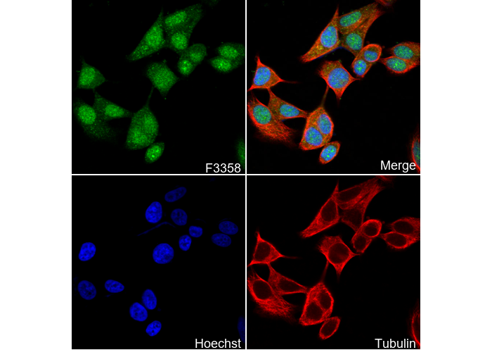 • Immunofluorescent analysis of MCF-7 cells using F3358 (green, 1:200), Hoechst (blue) and tubulin (Red).