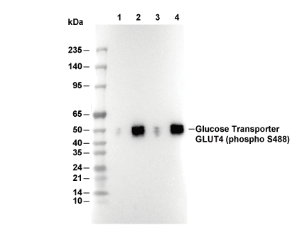 Phospho-Glucose Transporter GLUT4 (Ser488) Antibody [A20E7] detects endogenous levels of total Glucose Transporter GLUT4 protein only when it is phosphorylated at Ser488.