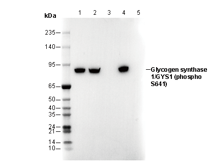 Phospho-Glycogen Synthase 1 (Ser641) Antibody [E2C19] detects endogenous levels of Glycogen Synthase 1/GYS1 only when phosphorylated at Ser 641.
