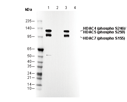Phospho-HDAC4 (Ser 246) + HDAC5 (Ser 259) + HDAC7 (Ser 155) are key phosphorylation sites on class IIa histone deacetylases (HDACs), which regulate gene expression by modulating chromatin structure through histone deacetylation. Phosphorylation at these serine residues is a critical mechanism controlling the subcellular localization and activity of these HDACs. Upon phosphorylation, these sites bind to 14-3-3 proteins, sequestering the HDACs in the cytoplasm and preventing their nuclear entry and transcriptional repression activity. HDAC4 phosphorylation at Ser 246, mediated by kinases like CaMKII and PKD, regulates muscle differentiation and neuronal function. Similarly, HDAC5 phosphorylation at Ser 259, also mediated by CaMKII, influences cardiac hypertrophy. HDAC7 phosphorylation at Ser 155, primarily by PKD, affects immune system regulation and vascular biology. These phosphorylation events integrate cellular signalling with epigenetic regulation, ensuring dynamic control of gene expression during development, differentiation, and stress responses. Dysregulation of these processes is linked to diseases such as cancer, neurodegenerative disorders, and cardiovascular conditions.
