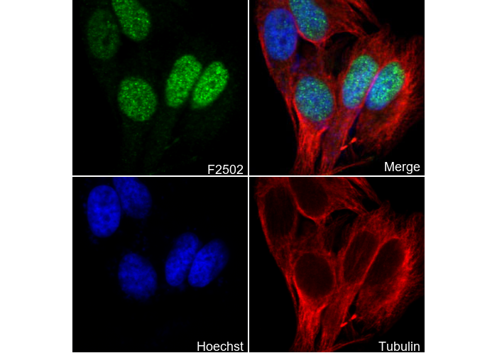 • Immunofluorescent analysis of Hela cells using F2502 (green, 1:100), Hoechst (blue) and tubulin (Red).