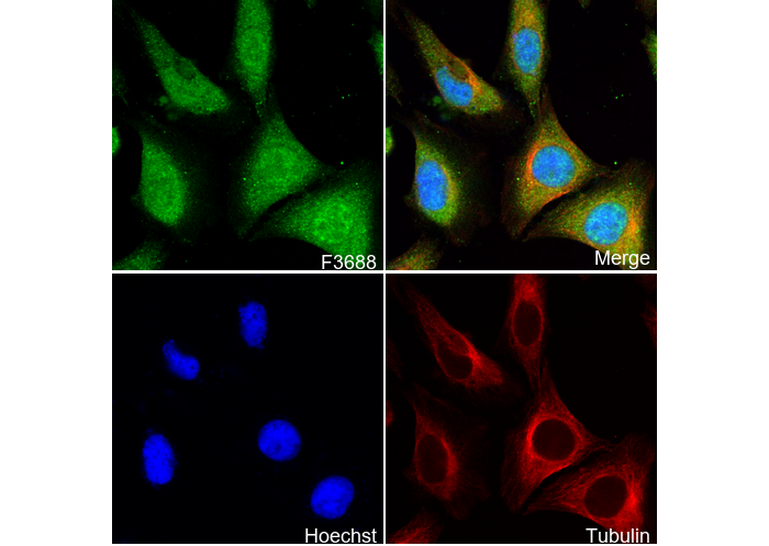 • Immunofluorescent analysis of Hela cells using F3688 (green, 1:100), Hoechst (blue) and tubulin (Red).