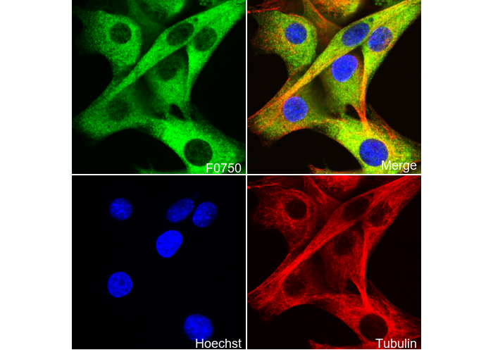 • Immunofluorescent analysis of C2C12 cells using F0750 (green, 1:50), Hoechst (blue) and tubulin (Red).