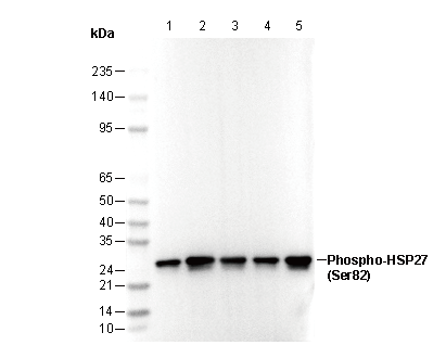 Phospho-HSP27 (Ser82) Antibody [J19L2] recognizes endogenous levels of HSP27 protein only when phosphorylated at Ser82.
