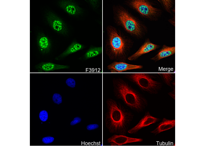 • Immunofluorescent analysis of Hela cells using F3912 (green, 1:50), Hoechst (blue) and tubulin (Red).