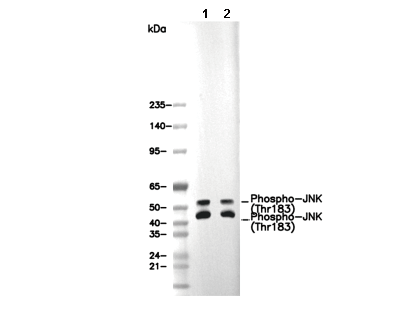 Phospho-JNK (Thr183) Antibody [D9B9] recognizes endogenous levels of total JNK protein only when phosphorylated at Thr183.