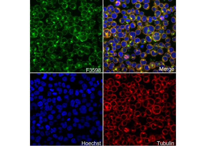 • Immunofluorescent analysis of Jurkat cells using F3598 (green, 1:250), Hoechst (blue) and tubulin (Red).