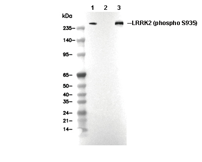 Phospho-LRRK2 (Ser935) Antibody [K11C19] detects endogenous levels of total LRRK2 protein only when it is phosphorylated at Ser935.