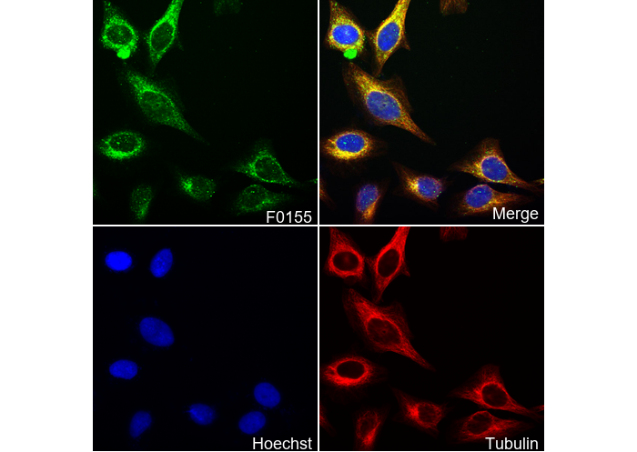 • Immunofluorescent analysis of Hela cells using F0155 (green, 1:800), Hoechst (blue) and tubulin (Red).