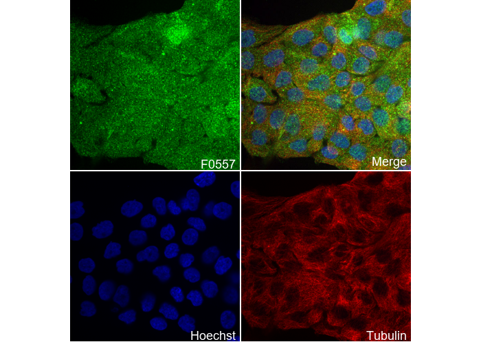 • Immunofluorescent analysis of A431 cells using F0557 (green, 1:50), Hoechst (blue) and tubulin (Red).