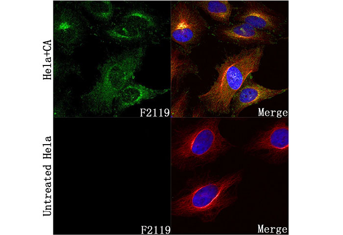• Immunofluorescent analysis of HeLa cells, untreated (lower) and treated with Calyculin A (100 ng/ml, 10 min) (upper), using Phospho-PKAR2/PKR2 (Ser 99) Rabbit mAb (green, 1:500), Hoechst (blue), and tubulin (red).