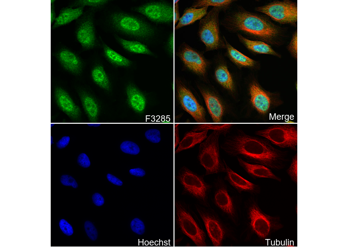 • Immunofluorescent analysis of Hela cells using F3285 (green, 1:50), Hoechst (blue) and tubulin (Red).